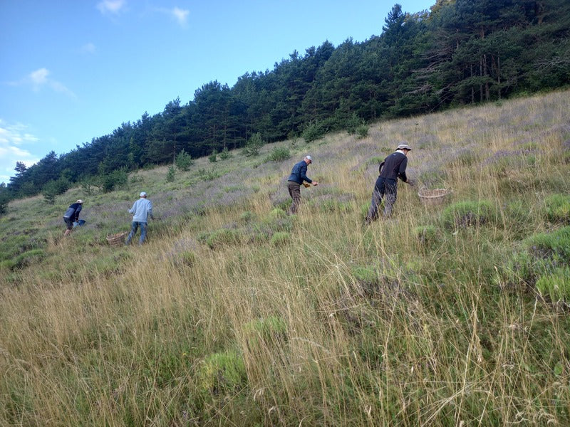 La lavande sauvage, autrement appelée lavande fine, lavande vraie, lavande officinale, a été récoltée dans le Diois entre 800 et 1000 mètres d’altitude, à maturité des sommités fleuries (fin juillet, début août).